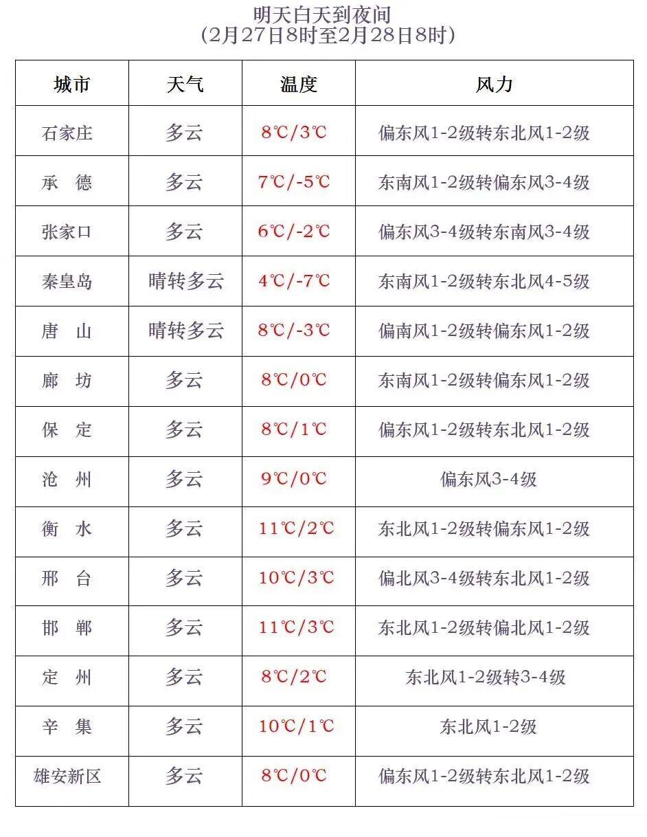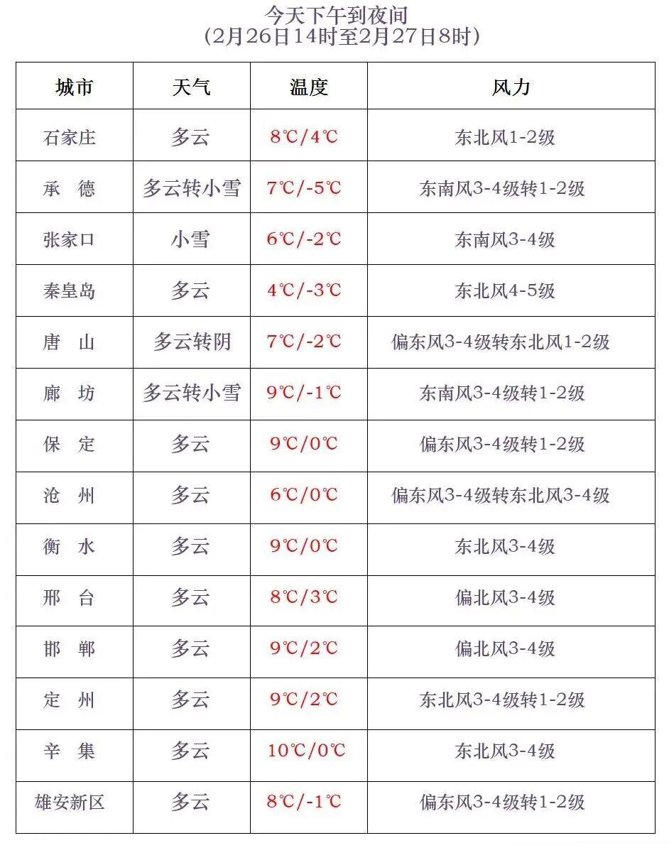 河北省气象台2026年2月26日11时发布天气预报: