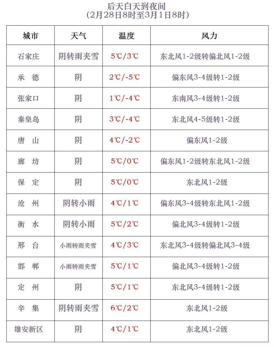 28日夜间到3月1日,石家庄、沧州及以南地区阴有小雨或雨夹雪,其中西部山区有小雪或雨夹雪;其他地区阴转多云。