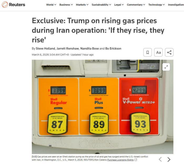 3月6日电 据路透社报道,美国总统特朗普5日接受该媒体采访时表示,他并不担心伊朗冲突升级导致美国汽油价格上涨,美国的军事行动才是他的首要任务。