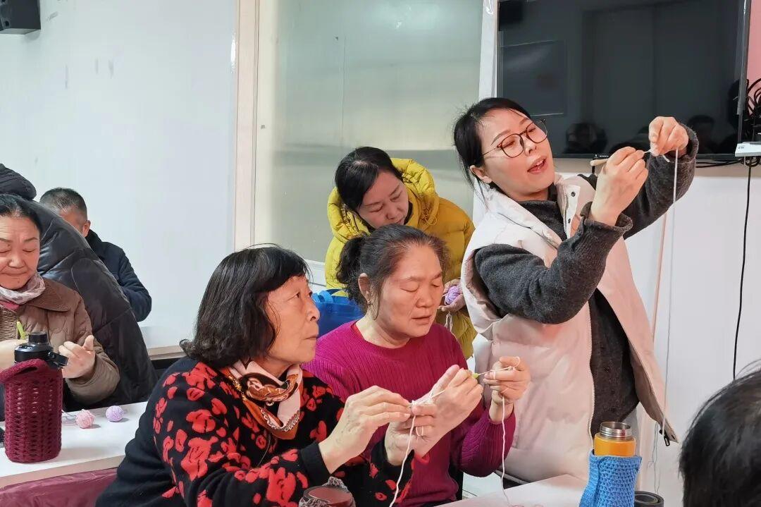 第一场教学从钩织“花瓣”开始,朱云娜手把手教学员们如何握钩针,毛线在指尖怎么缠绕,基础长短针怎么钩。老年学员们在飞针走线间,感受着传统手工艺术的独特魅力。