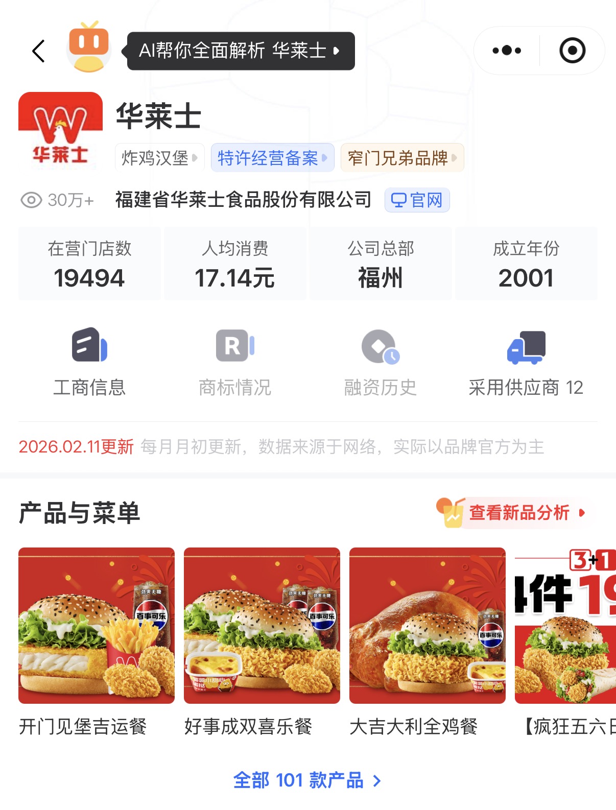 据窄门餐眼,华莱士目前在营店数超1.9万家,人均消费17.14元。企查查APP显示,福建省华莱士食品股份有限公司成立于2009年8月,法定代表人华怀余,注册资本约2.07亿元,由华怀余、凌淑冰等共同持股。华士食品控制企业达25家,包括山东新食州食品有限公司、浙江华莱士食品有限公司等。2025年上半年财报显示,华士食品营收46.25亿元,同比微降0.49%;净利润1.22亿元,同比上涨35.32%。