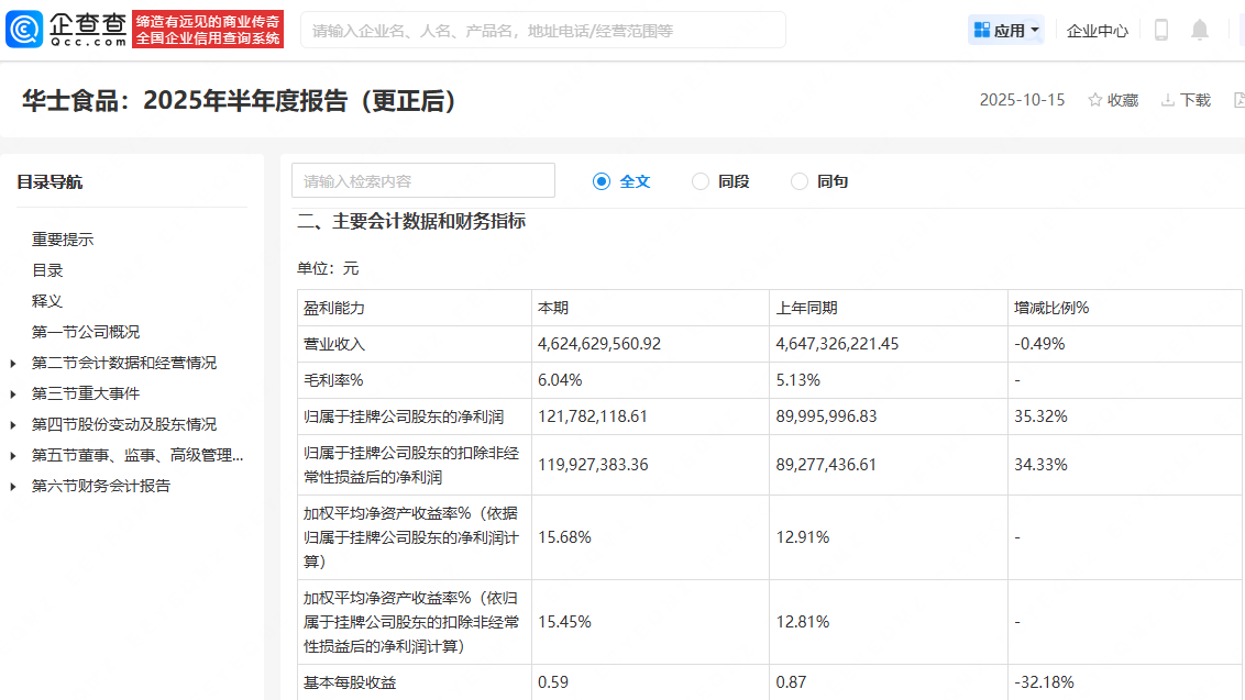 据华士食品公布的2025半年报显示,公司2025年上半年营收约46.25亿元,归母净利润逾1.21亿元,较上年同期增长35.32%。