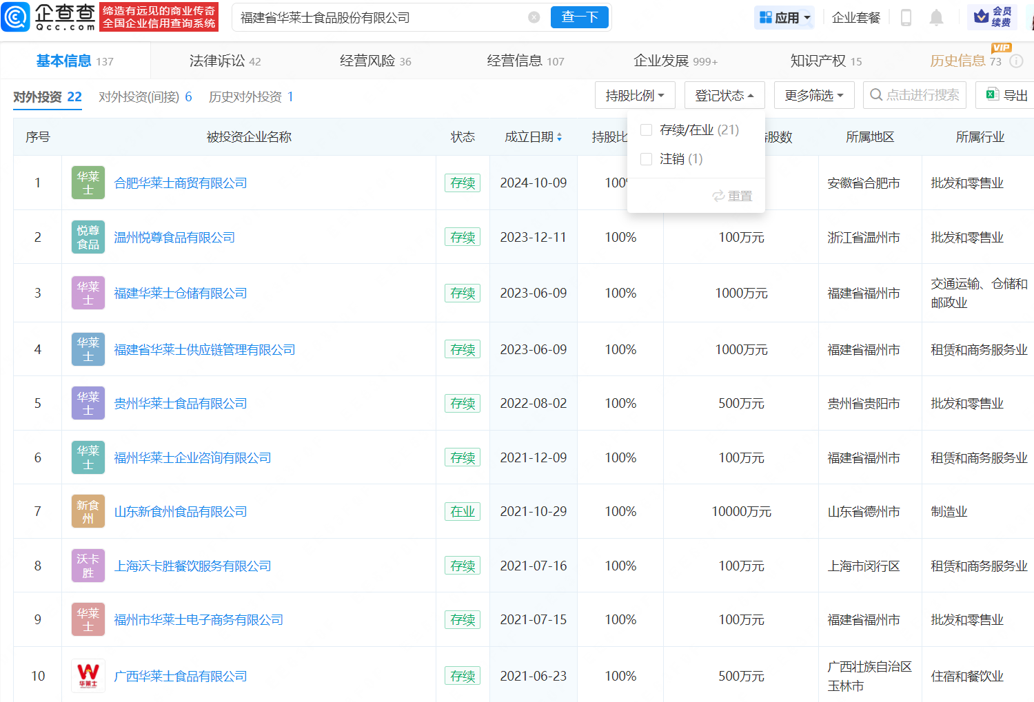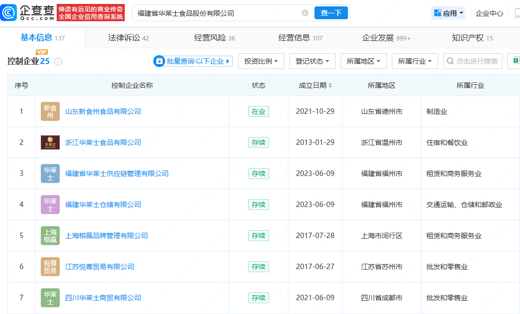对外投资信息显示,华莱士对外投资20多家企业,包括合肥华莱士商贸有限公司、福建华莱士仓储有限公司、广西华莱士食品有限公司、福州市华莱士电子商务有限公司等,覆盖商贸、食品、电商、供应链管理等多个领域。