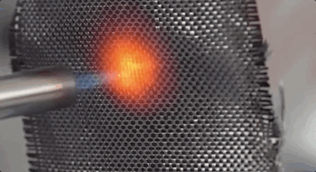 用喷枪进行火烧测试,碳纤维编织的布料中间已经被烧红,却没有冒烟,更不会被点燃,安全性能非常好。
