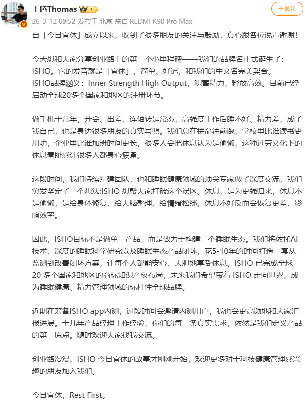 3月12日,今日宜休创始人王腾在社交媒体宣布,全新品牌正式定名ISHO,并透露ISHO App已进入内测筹备阶段,后续将面向用户开放邀请测试。
