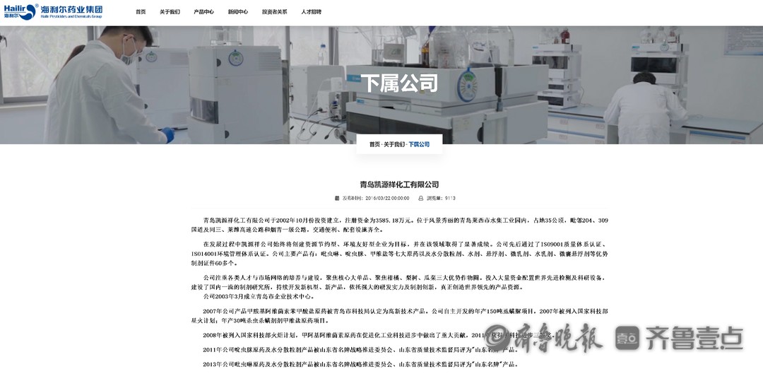 海利尔官网介绍,青岛凯源祥化工有限公司于2002年10月份投资建立,注册资金为3585.18万元。公司先后通过了ISO9001质量体系认证、ISO14001环境管理体系认证。公司主要产品有:吡虫啉、啶虫脒、甲维盐等七大原药以及水分散粒剂、水剂、悬浮剂、微乳剂、水乳剂、微囊悬浮剂等优势制剂证件60多个。