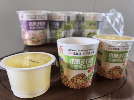 北青报记者在电商平台选购了一款“水果沙拉味低糖可吸果冻”和一款栗子羹产品进行实测,发现这两款产品存在典型的“大包装套小内容”现象。其中,果冻内含8杯,单杯杯口直径7厘米,杯身外部高度为7厘米,从视觉上给人一种大容量的直观感受。但北青报记者实测发现,果冻杯的实际高度仅为4.6厘米。造成容量错觉的原因在于,杯身被套入了一个高7厘米的纸质外包装套中,近三分之一的空间被纸套占据,相当于给果冻穿上了一双“增高鞋”。该果冻产品标注净含量为120克,称重实测为127克,虽然并未缺斤短两,但这种通过外包装营造“大体量”错觉的设计,仍让消费者产生了上当受骗的感觉。
