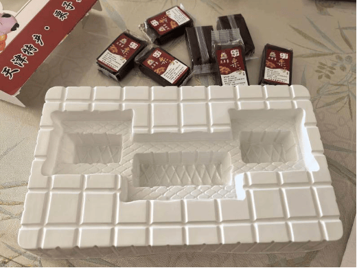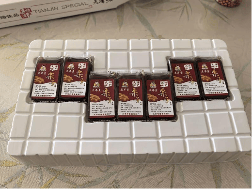 另一款实测的天津特产栗子羹产品,其包装误导性更为明显。该产品外盒为透明倒“凸”字形,从外观看,栗子羹从左至右码放整齐,给人一种满满一盒的直观感受。但打开包装后,实际内容却与视觉预期相去甚远——一整盒内仅有7块栗子羹。经测量,外包装长27厘米、宽16厘米、厚4厘米,整体体积达1728立方厘米;而单支栗子羹体积仅约36立方厘米,按外包装容积推算,理论上可放置48块。为让少量产品撑满包装高度,生产厂家在放置栗子羹的硬质塑料内托上做了凹陷设计,将栗子羹嵌入其中,其余空间均为塑料内托。这款产品标注净含量为260克,但未标明具体块数。北青报记者称重显示,单块栗子羹约38克,7块总重271克,虽未缺斤短两,但视觉上的“虚胖”包装依然让实测者感受到强烈的视觉欺骗。