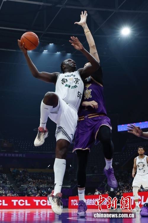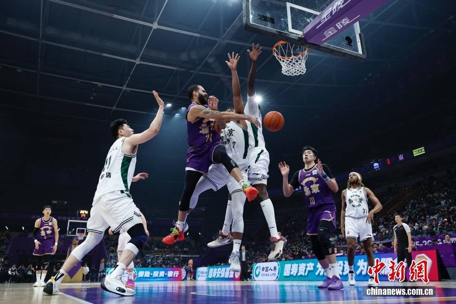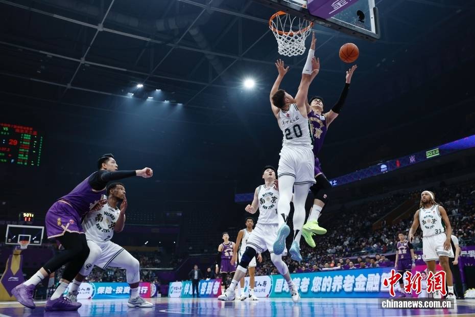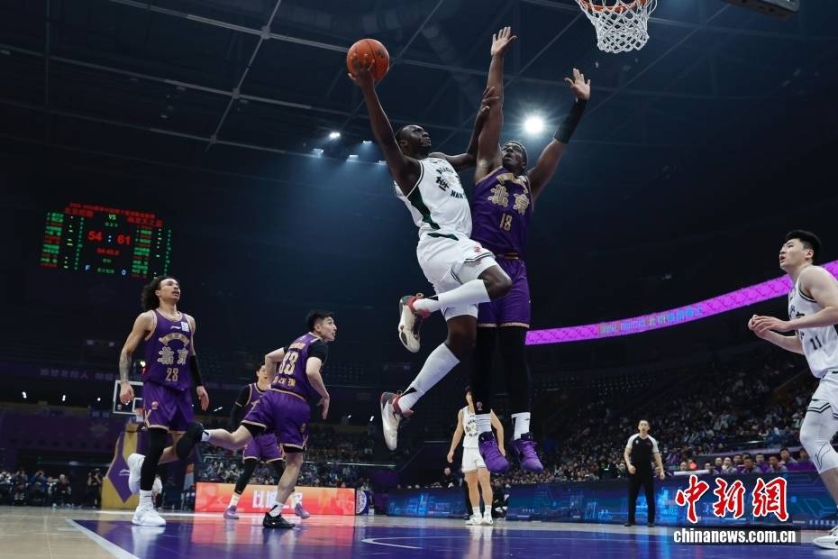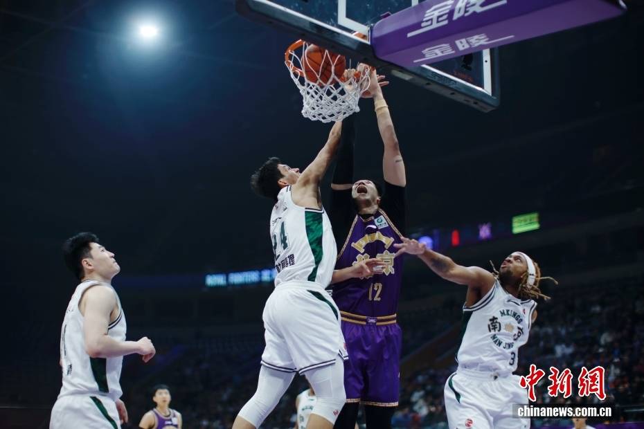 3月26日,在北京国家体育馆举行的2025-2026赛季中国男子篮球职业联赛(CBA)常规赛比赛中,北京控股队主场101比108负于南京天之蓝队。图为北京控股队沈梓捷(紫衣)在比赛中扣篮。中新社记者 韩海丹 摄