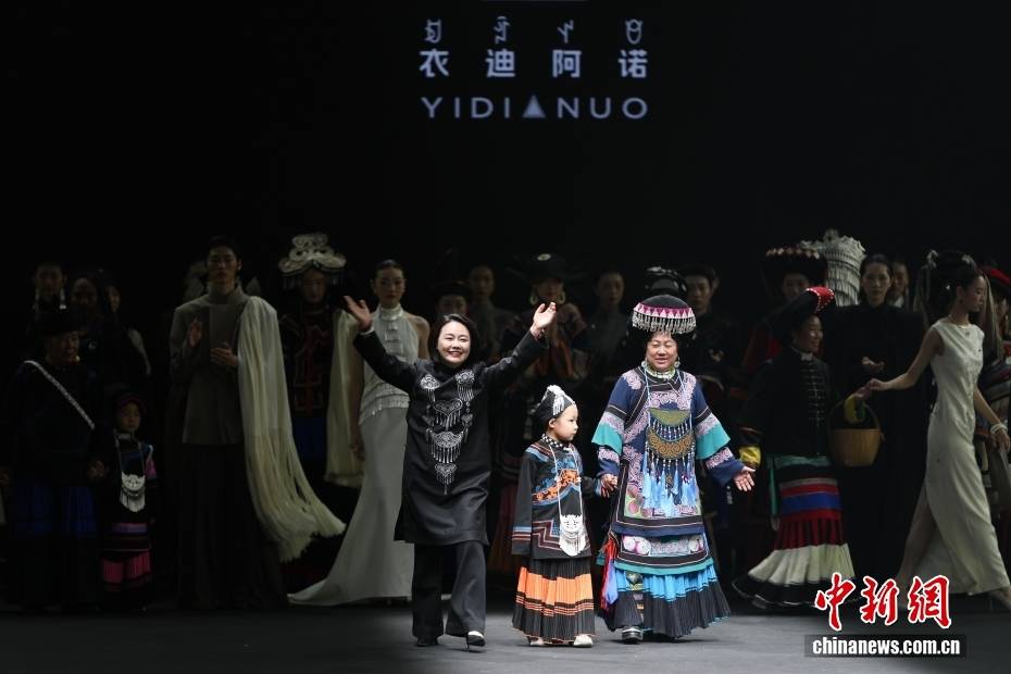 3月26日,北京服装学院梁燕教授团队携手凉山彝族创新品牌“衣迪阿诺”时装作品亮相2026中国国际时装周(春季)。图为梁燕(左一)和模特登台致谢。中新社记者 盛佳鹏 摄