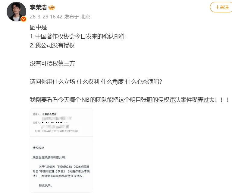 随后,李荣浩再发著作权协会情况说明,控诉单依纯:请问你用什么立场?什么权利?什么角度?什么心态演唱?我倒要看看,今天哪个团队能把这个明目张胆的侵权违法案件糊弄过去!!!