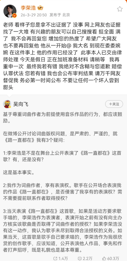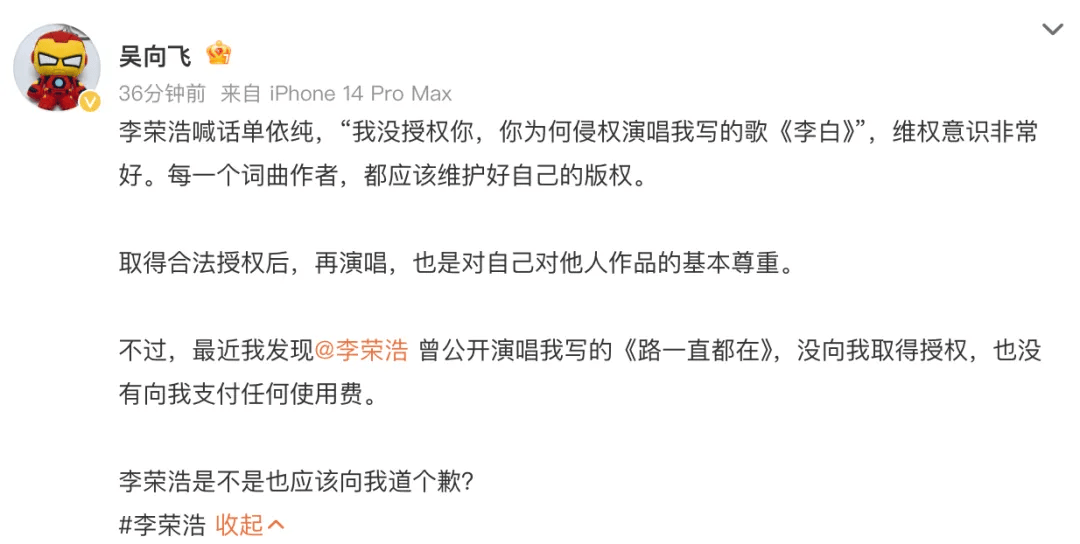 没想到,填词人吴向飞突然发文称,李荣浩曾公开演唱其创作的《路一直都在》,并未取得本人授权,全文如下——
