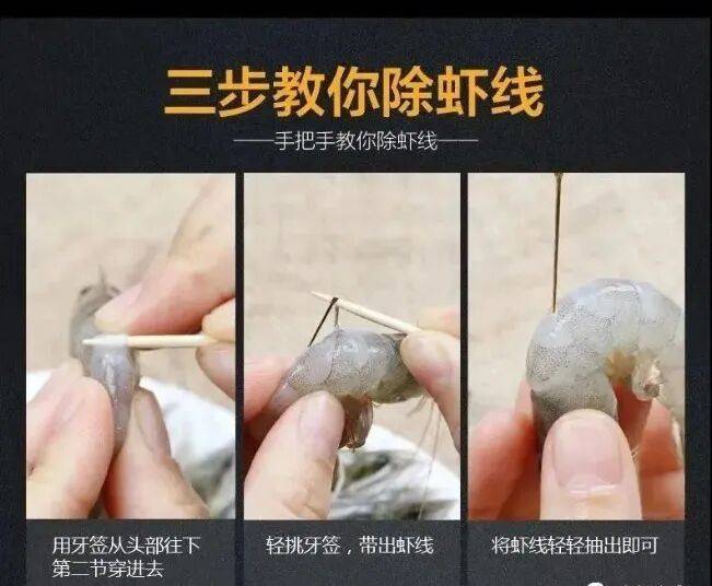 从虾的头部开始沿着它的背部数到第三节,然后在这个位置插入牙签轻轻一拔,虾线就挑出来了~