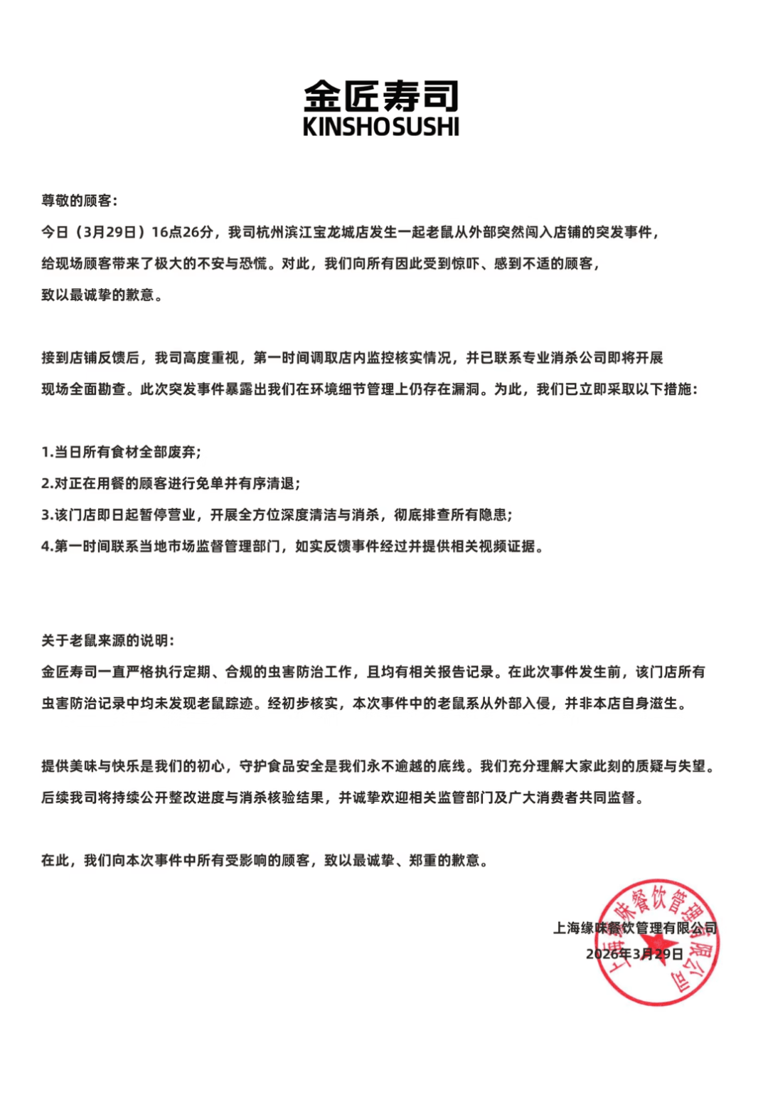 3月29日晚,金匠寿司就浙江杭州滨江宝龙城店发生老鼠闯入门店事件发布致歉声明: