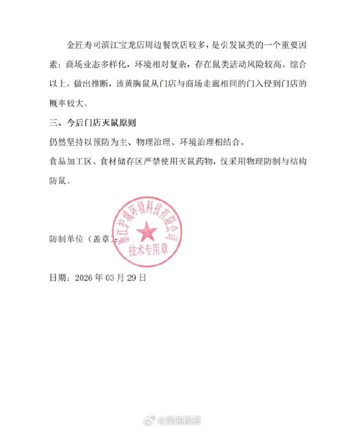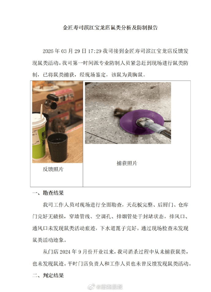 金匠寿司进一步称,涉事门店此前一直按规定开展虫害防治,未发现鼠踪。根据第三方出具的鼠类分析及防治报告,此次捕获鼠类为黄胸鼠,结合现场勘查情况判断,老鼠大概率由门店与商场走廊相通的入口侵入,并非门店内部滋生。