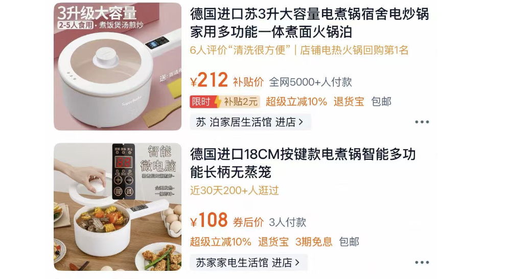 记者进一步调查发现,“伪进口”乱象并非只存在于电热锅品类,还涉及豆浆机、养生壶、电热水壶、家用烘干机等多种小家电。记者咨询客服后得知,这些产品均非真正进口,所谓“日本进口”“德国进口”,实则是“日本品质”“德国品质”的简称,产品均为国内代加工生产。