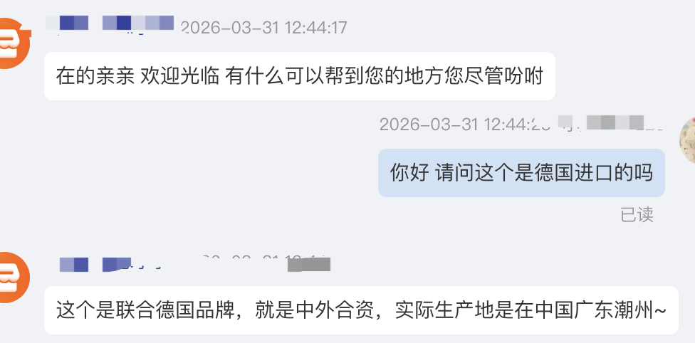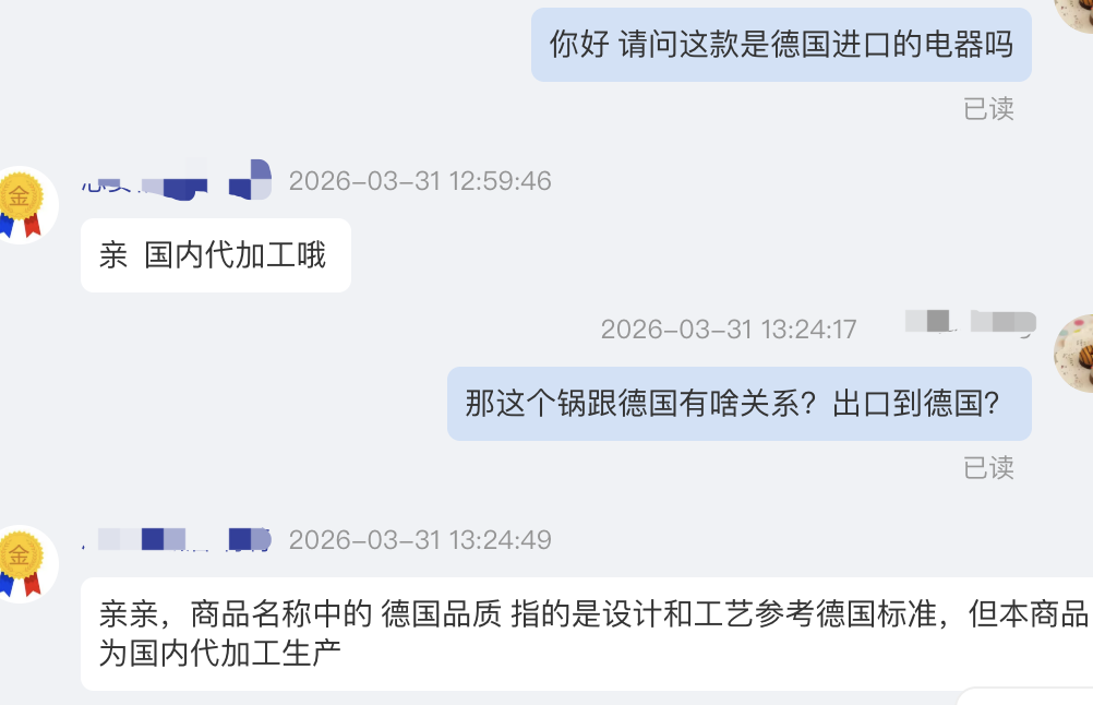 随后,记者随机选取了几家家标注“德国电热锅”的网店,逐一咨询客服产品是否为德国进口。令人意外的是,所有客服均明确表示,产品并非德国进口,“德国”字样仅为宣传话术。“我们的产品是德国技术,国产品牌,在国内生产的。”“商品标题里的‘德国品质’,是指设计和生产工艺参考德国标准,并非进口产品。”还有客服坦言,标注“德国”相关字样,主要是为了提升产品吸引力,迎合消费者对德国制造的信任。记者注意到,这些网店的产品详情页中,产地一栏有的会标注为“海外某地”,未明确具体国家,刻意模糊产地信息。