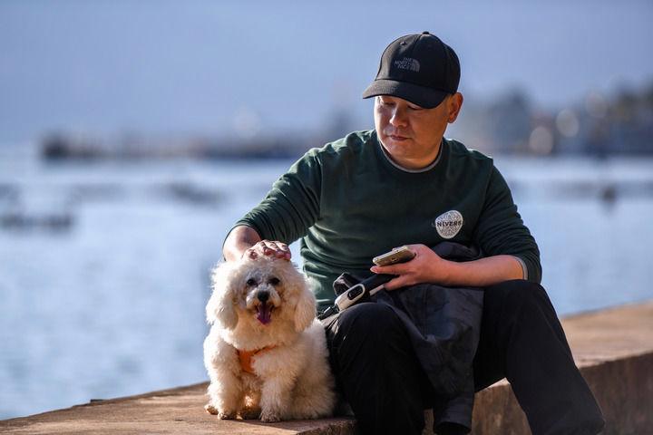 自驾来昆明的游客带着宠物狗在滇池畔赏鸥。新华社发
