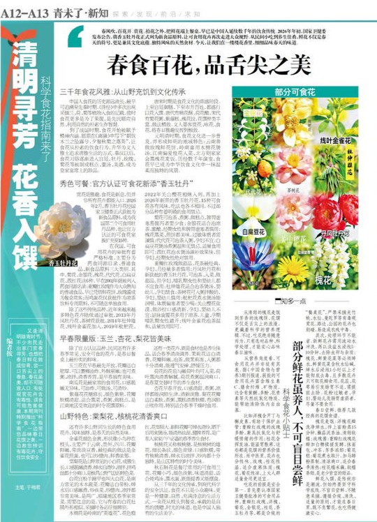春风吹,百花开。赏花、拍花之外,把鲜花端上餐桌,早已是中国人延续数千年的饮食传统。2026年年初,国家卫健委发布公告,将香玉牡丹花正式列为新食品原料,让可食用花卉再次走进大众视野。从民间小吃到养生佳肴,鲜花不仅是春天的符号,更是兼具文化底蕴、独特风味的天然食材。今天,让我们在一缕缕花香里,细细品味春天的味道。