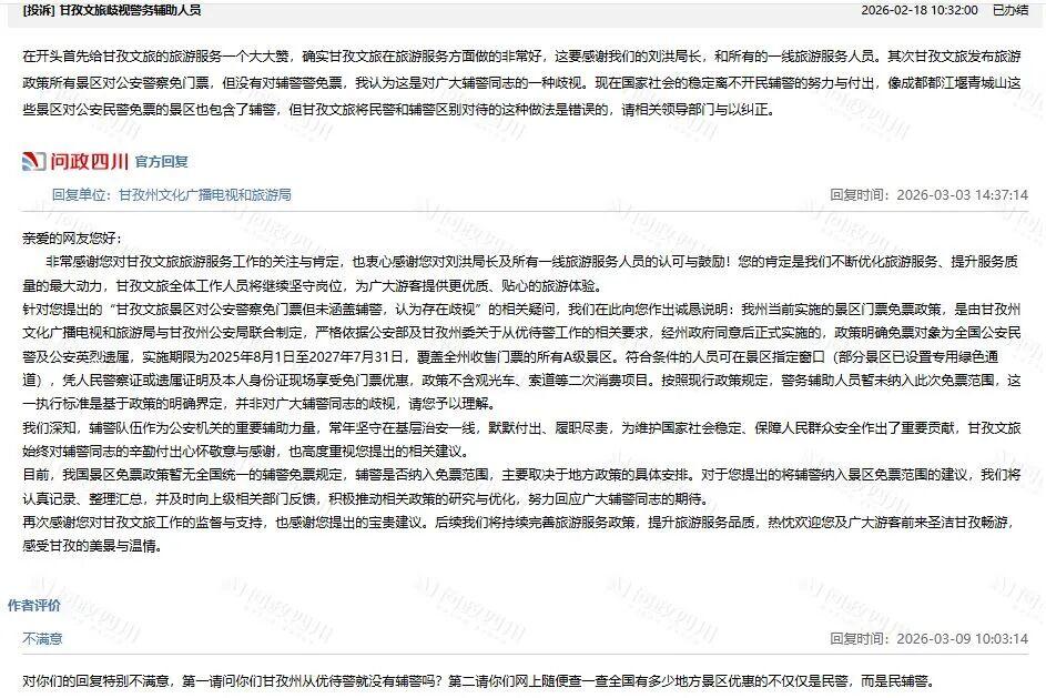 该回复表示,辅警作为公安机关的重要辅助力量,为保障群众安全作出了重要贡献,甘孜文旅始终对辅警同志的辛勤付出心怀敬意与感谢。对于将辅警纳入景区免票范围的建议,会及时反馈给上级部门,积极推动相关政策的研究与优化。该网友对此回复不满意,表示全国很多地方优惠的不只是民警,而是民辅警。