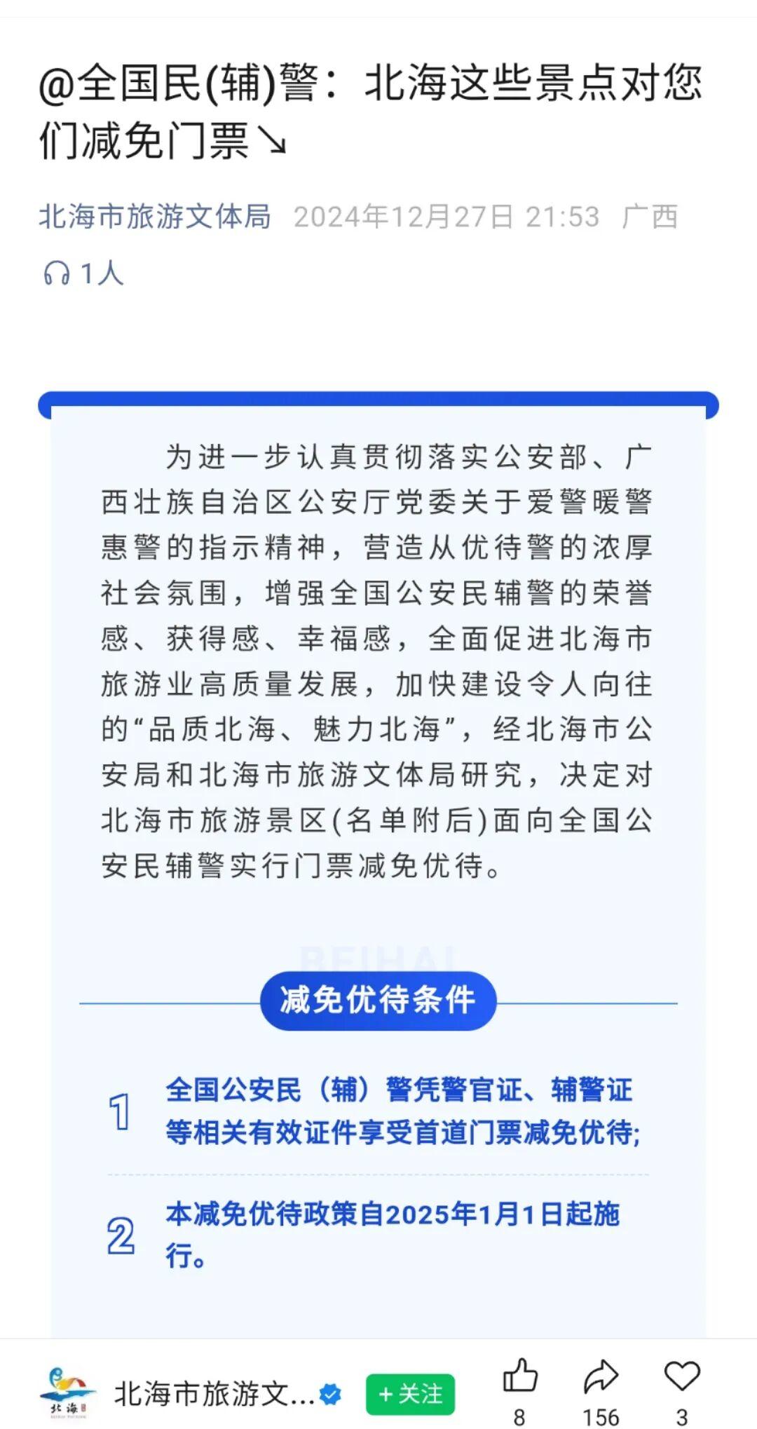 记者梳理发现,近年来,全国多地文旅局及景区出台了对公安机关民辅警的门票优惠措施。如2024年末,广西北海市出台政策,决定自2025年起,当地多个景点对全国民辅警实行门票减免优待。此外,云南临沧、湖南郴州等地也出台了相似政策。这些地方的免票对象都包含辅警。