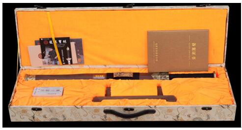 整体礼盒包装,实木剑架,备案证书,收藏证书,保养油套盒一应俱全。