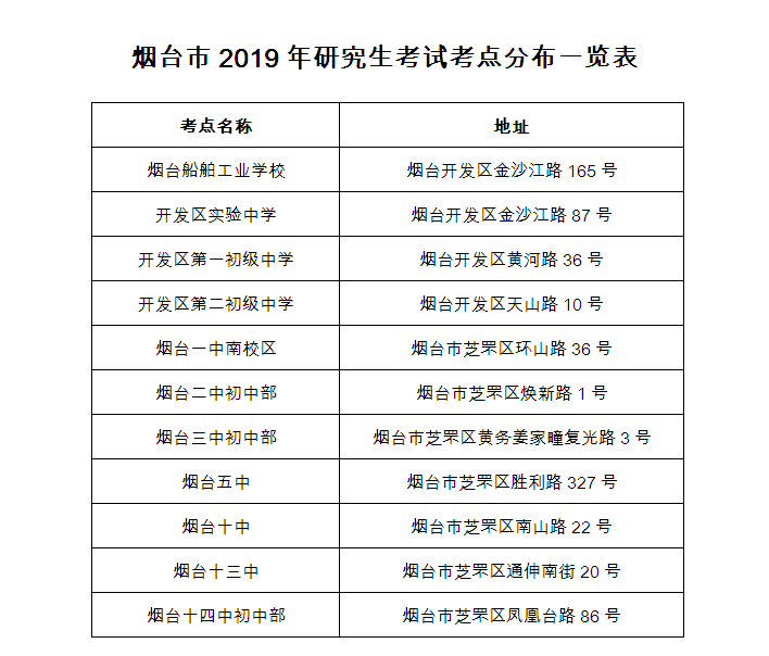 今年烟台市共有考生21063人,比2018年增加约4000人,创历史新高。全市设22 个考点,703个考场。其中芝罘区有烟台一中南区、二中初中部、三中初中部、 五中、十中、十三中、十四中初中部和烟台城乡建设学校等8个考点,开发区有 烟台船舶工业学校、开发区实验中学、开发区一中、二中等4个考点,福山区有 烟台市实验中学、崇文中学等2个考点,牟平区有牟平实验中学、宁海中学、文 化一中、文化二中等4个考点,莱阳市有莱阳市实验中学、实验二中、府前中学 和文峰中学等4个考点。这也是今年首次在烟台六区外设立考研考点。