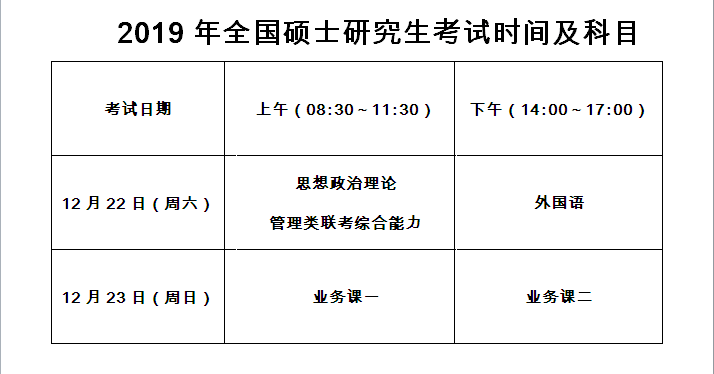据介绍,2019年全国硕士研究生入学考试将于2018年12月22日(周六)至23日( 周日)进行,其中 12月22日上午08∶30~11∶30考思想政治理论或管理类联考 综合能力;下午2∶00~5∶00考外国语;12月23日上午08∶30~11∶30考业务课 一;下午2∶00~5∶00考业务课二。考生开考15分钟后考生不得入场。考试结束 前30分钟经主考允许方可交卷出场。考生交卷出场后不得再进场续考,也不得在 考场周围逗留。